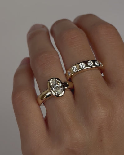 Metal and Dust signature bold, bezel set Oval Solitaire Engagement ring. This style features a thick low bezel setting and a wide profile band. Formed slowly from wax before casting in solid 9ct yellow gold.