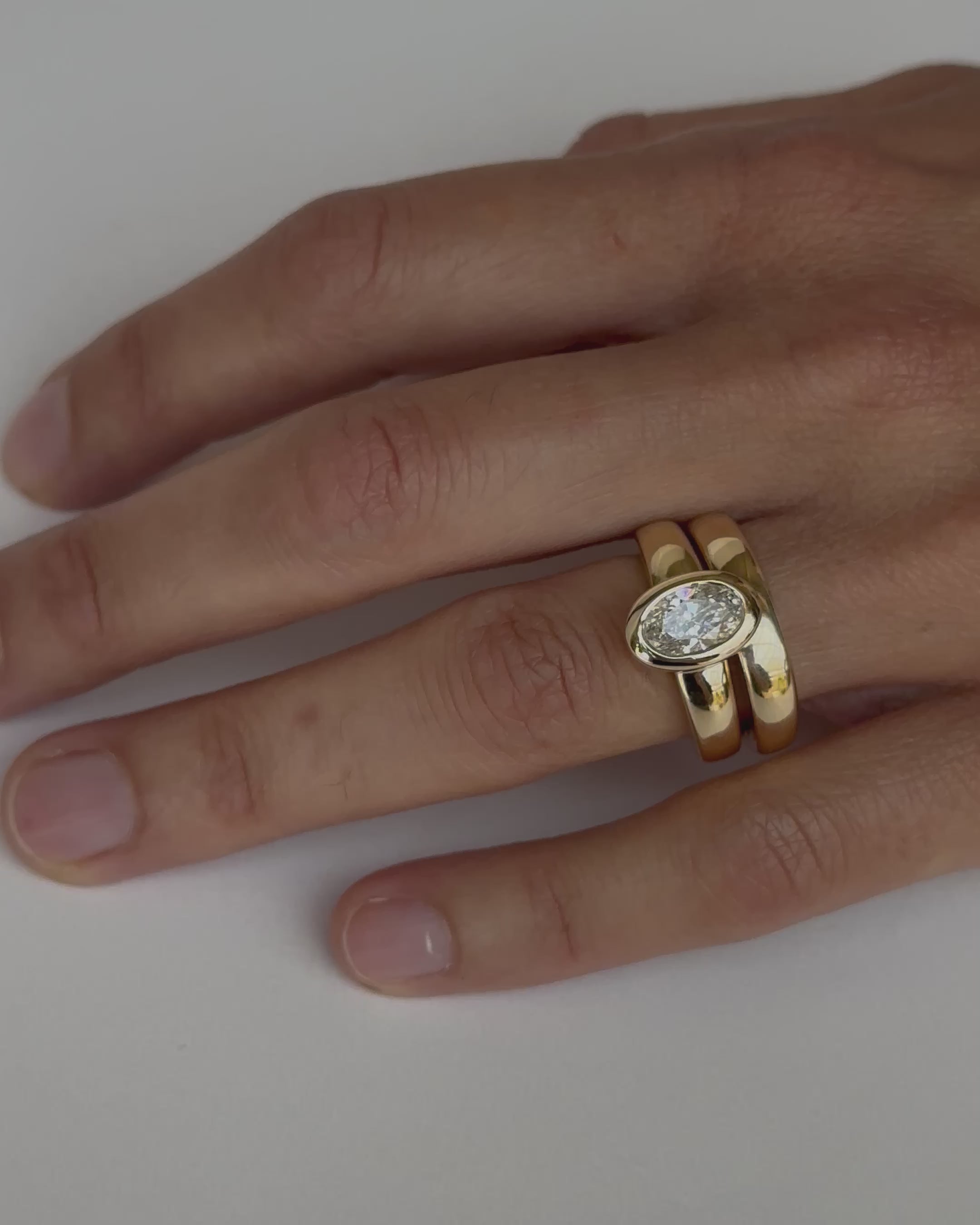 Metal and Dust signature bold bezel set Oval Solitaire Engagement ring and wedding band set. Made to fit perfectly flush with each other. Formed slowly from wax before casting in solid 9ct yellow gold, finished with a high shine.