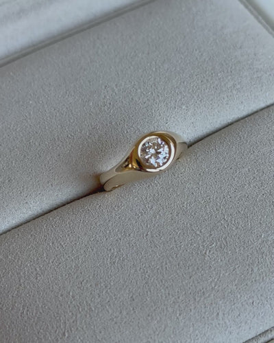 Sade has an asymmetrical curved band profile, set with your preference of 0.7ct or 1ct Round Brilliant cut diamond. Formed slowly from wax before casting in solid 9ct yellow gold.