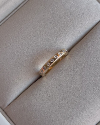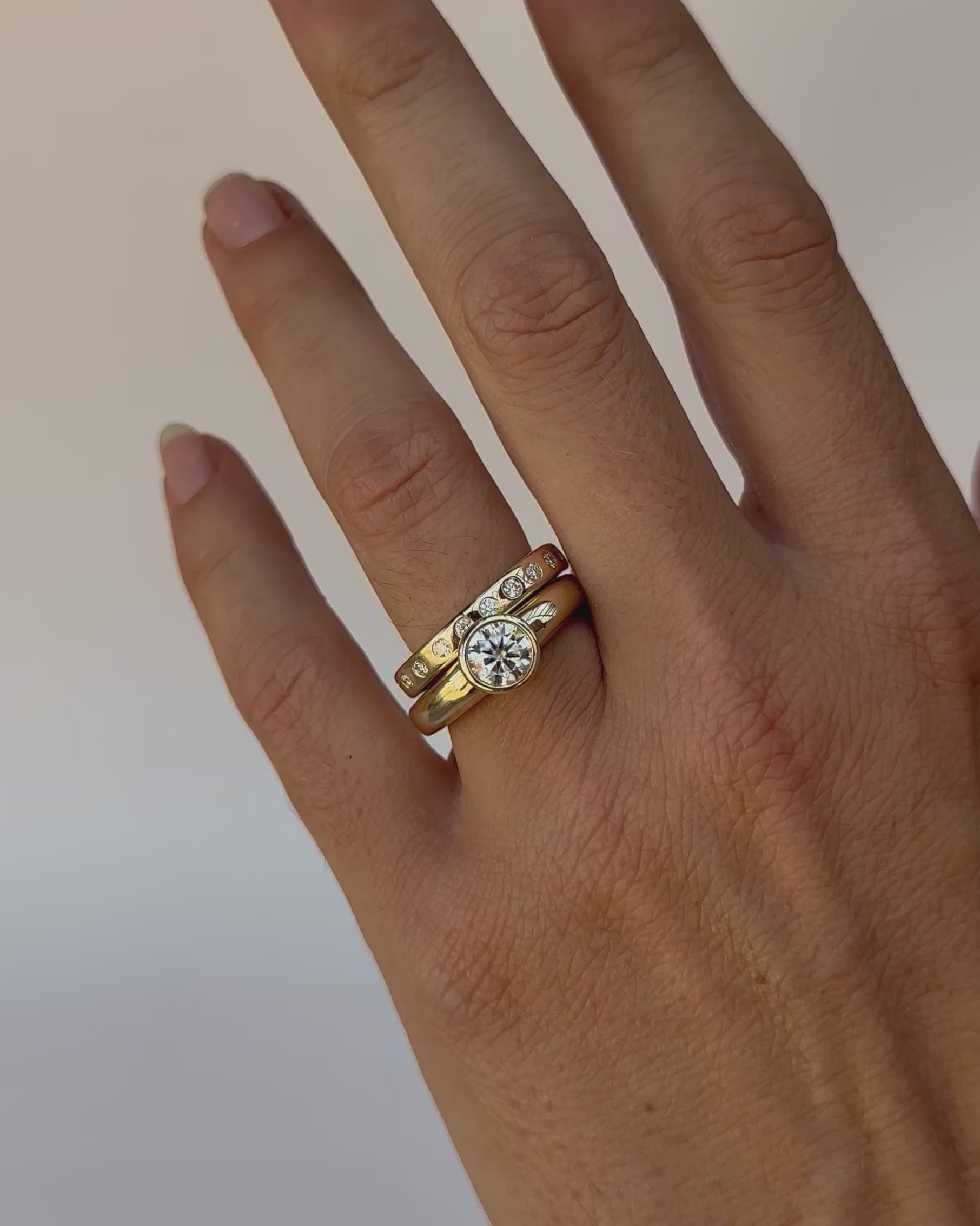 Solene is the most delicate diamond band in the collection. Designed to fit seamlessly into your daily collection and sits perfectly alongside the Future Lover Solitaire ring as a ceremonial pair. Solene has a soft, square profile with 11 flush set round diamonds.